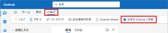 - Outlook(new)の「ヘルプ」タブに「従来のOutlookに移動」がある場合