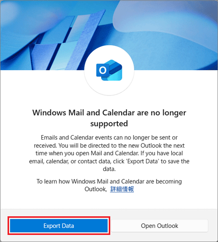 - 「Windows Mail and Calendar are no longer supported」の「Export Data」ボタンをクリックします。