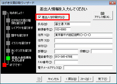 はがきの文面側には差出人を印刷したくない場合は、「差出人を印刷する」のチェックを外します。 - 差出人情報(氏名、郵便番号、住所1、電話番号など)を確認します。