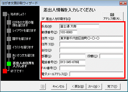 - 「差出人情報を入力してください」と表示されます。