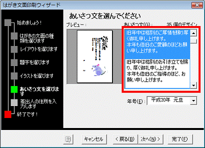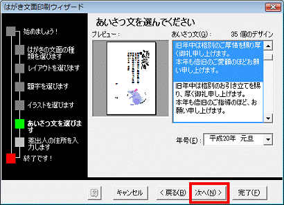 - あいさつ文で使用したい文章と年号の形式を選択したら、「次へ」ボタンをクリックします。