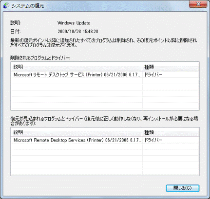 復元ポイントを選択した状態で「影響を受けるプログラムの検出」ボタンをクリックすると、「削除されるプログラムとドライバー」と「復元が見込まれるプログラムとドライバー(復元後に正しく動作しなくなり、再インストールが必要になる場合があります)」を確認できます。
