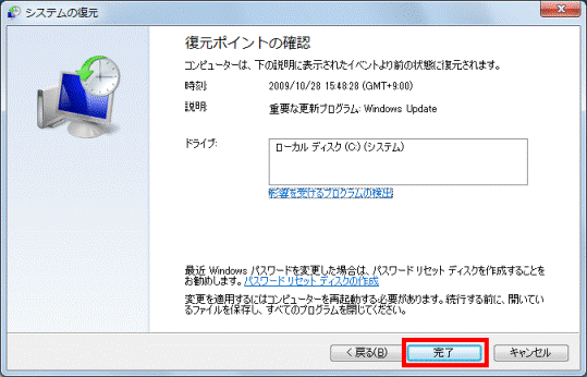 8. 復元ポイントの時刻や説明を確認し、復元して問題がなければ「完了」ボタンをクリックします。