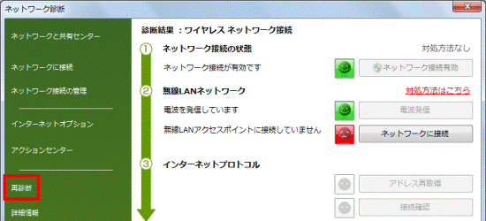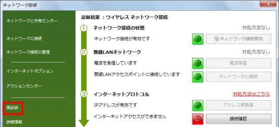 - 「ネットワーク診断」の「再診断」をクリックし、もう一度診断結果を確認します。