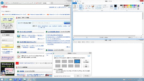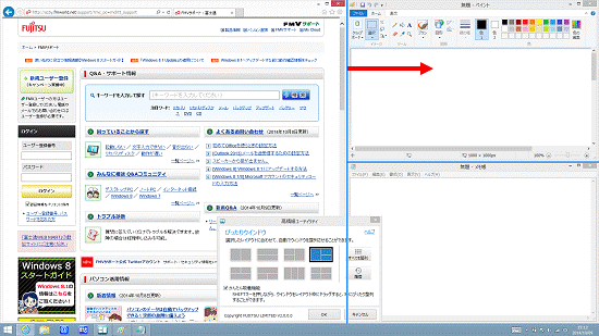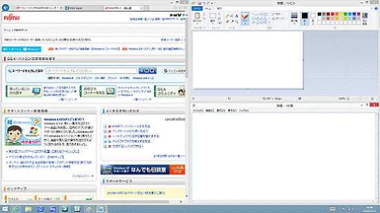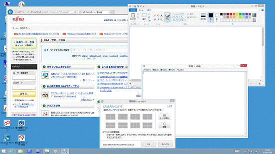 (Internet Explorer、ペイント、メモ帳を起動した後の状態) - 「ぴったりウィンドウ」のレイアウトの一覧から、お好みのレイアウトをクリックします。