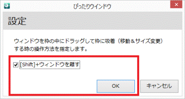 手順7.の操作を、【Shift】キーを押しながら実行するように変更したい場合は、「ぴったりウィンドウ」の「設定」で、「 [ Shift ] + ウィンドウを離す」をクリックしチェックを付けて「OK」ボタンをクリックしてください。