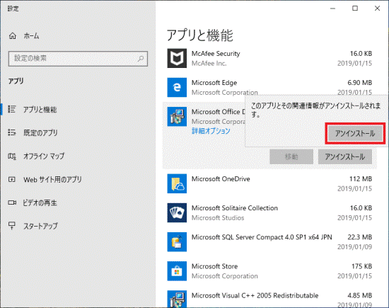 「アプリと機能」の「×」ボタンをクリックして、閉じます。