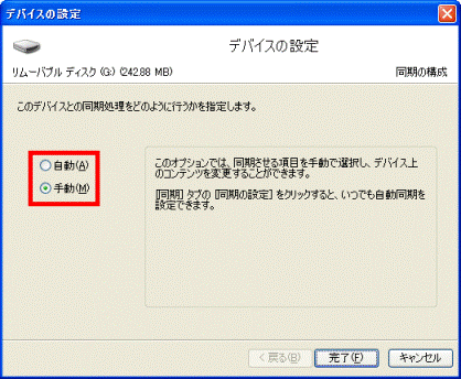 「デバイスの設定」が表示された場合は、次のいずれかの項目をクリックし、「完了」ボタンをクリックします。- 自動:全曲を転送する場合
