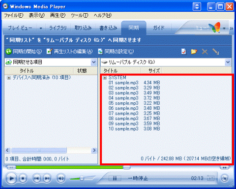 次の手順で、Windows Media Playerの同期で、音楽ファイルを転送します。