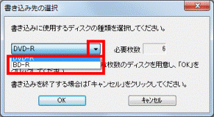- BD-Rを使用する場合は、「▼」ボタンをクリックし、表示されるメニューから「BD-R」をクリックしてから、次の手順に進みます。