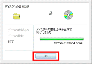 書き込みが完了するまで、しばらく待ちます。 - 「ディスクへの書き込みが正常に終了しました」(または「ディスクへの書き込みが終了しました」)と表示されます。