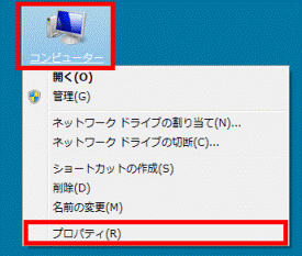 - 「コンピューター」を右クリックし、表示されるメニューから「プロパティ」をクリックします。