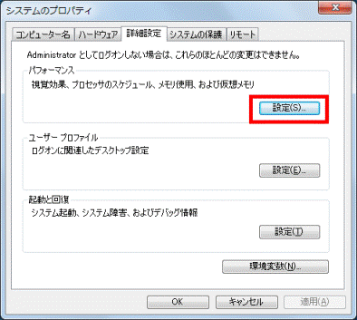 「パフォーマンス」欄にある「設定」ボタンをクリックします。