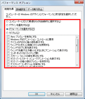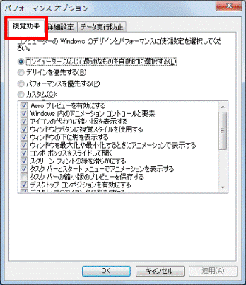 標準の設定にするときや、視覚効果を有効にするときは、次の項目を選択します。- コンピューターに応じて最適なものを自動的に選択する