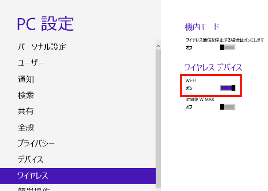 - 「ワイヤレスデバイス」にある「Wi-Fi」のスイッチをクリックして、オン / オフを切り替えます。