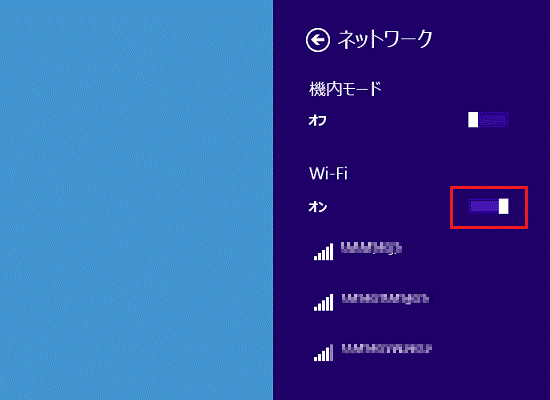 - 「ネットワーク」の「Wi-Fi」のスイッチをクリックして、オン / オフを切り替えます。