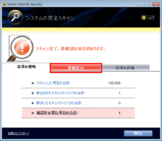 - スキャン結果が表示されている画面の「要確認」タブをクリックします。