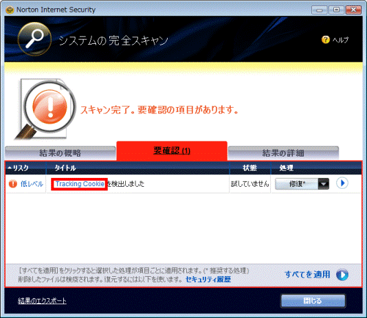 [Norton Internet Security 2009] 初期セットアップ直後に「完全スキャン」を実行すると、「Tracking Cookie」が検出されます。