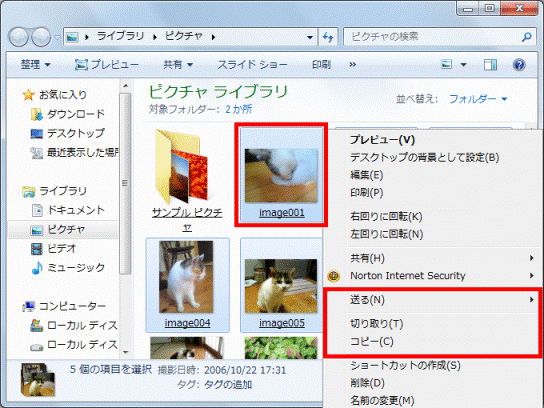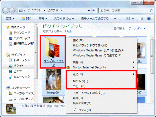選択したファイルを右クリックし、表示されるメニューから、「送る」や「コピー」などを選択できます。