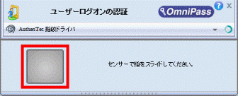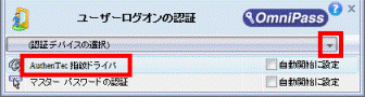 「認証デバイスの選択」または「マスター パスワードの認証」と表示されている場合は、「▼」ボタンをクリックし、表示される一覧から、「AuthenTec 指紋ドライバ」、または「指紋センサー」をクリックします。