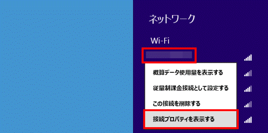 設定を確認するネットワーク名(SSID)を右クリックし、表示されるメニューから「接続プロパティを表示する」をクリックします。