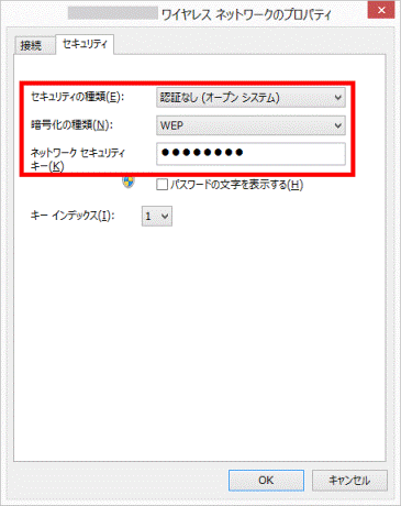 なお、セキュリティの種類によっては、セキュリティキーが変換されるため、ルーターやアクセスポイントの値とは異なる場合があります。 - セキュリティには、 WEP または TKIP 以外の設定をご利用になることをお勧めします。