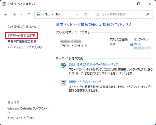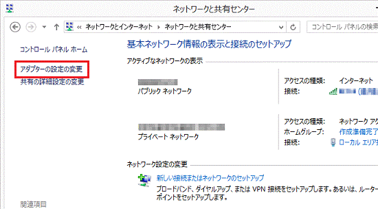 - 「アダプターの設定の変更」をクリックします。