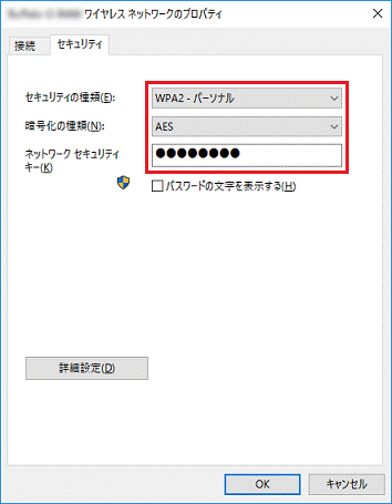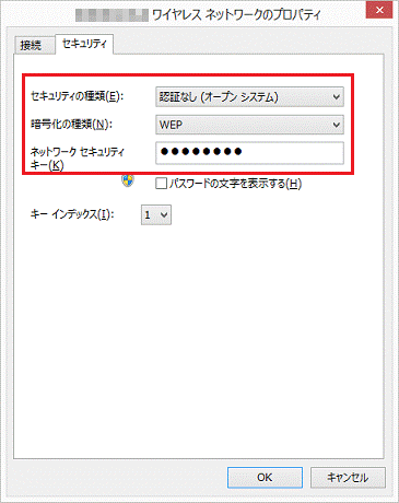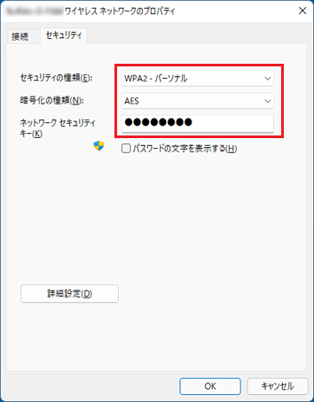 - 「セキュリティの種類」、「暗号化の種類」、「ネットワークセキュリティキー」の右側に表示されている項目を確認します。