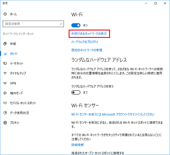 - 「利用できるネットワークの表示」をクリックします。