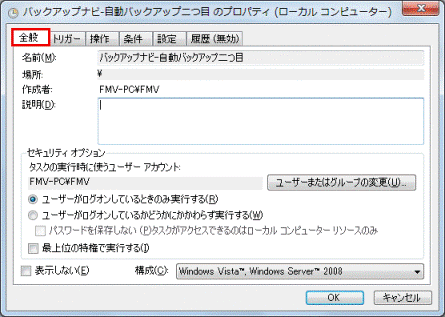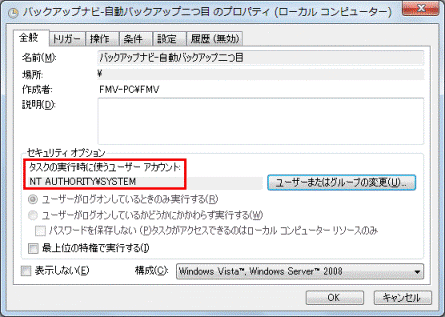 「タスクの実行時に使うユーザーアカウント」欄に、「NT AUTHORITY¥SYSTEM」と表示されていることを確認します。