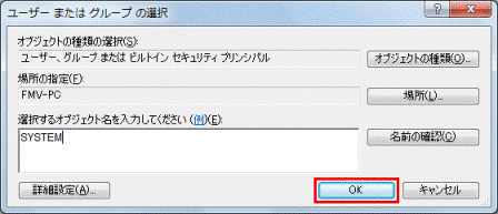 「選択するオブジェクト名を入力してください」欄に、「SYSTEM」と入力します。