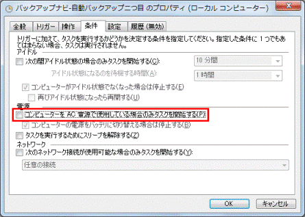 - 「コンピューターをAC電源で使用しているときのみタスクを開始する」をクリックし、チェックを外します。