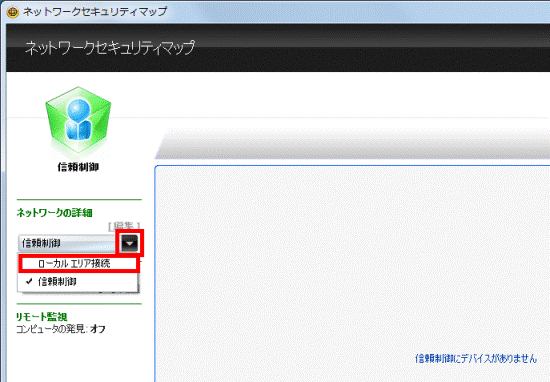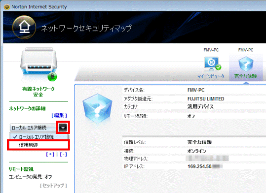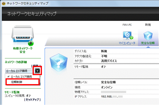 「ネットワークの詳細」の下にある「▼」ボタンをクリックし、表示されるメニューから「信頼制御」をクリックします。