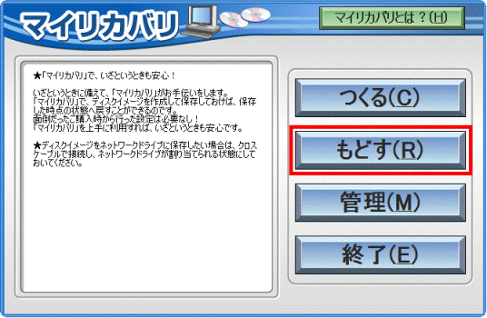 - 「スタート」ボタン→「すべてのプログラム」→「マイリカバリ」の順にクリックします。