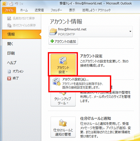 - 「アカウント設定」ボタンをクリックし、表示されるメニューから「アカウント設定」をクリックします。