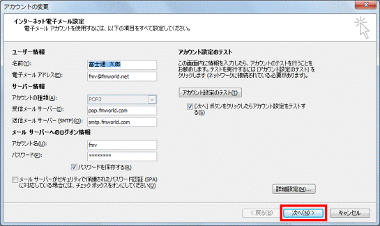 - 「アカウントの変更」の「次へ」ボタンをクリックします。