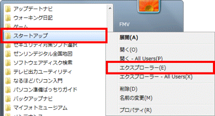 - 「スタートアップ」を右クリックし、表示されるメニューから「エクスプローラー」(または「エクスプローラ」)をクリックします。