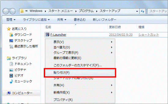 - 「スタートアップ」フォルダーの何もないところで右クリックし、表示されるメニューから「貼り付け」をクリックします。