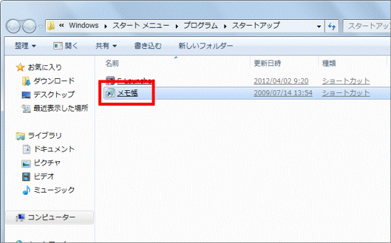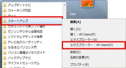 「スタートアップ」フォルダーは表示したままで、次の手順に進みます。 - 「スタート」ボタン→「すべてのプログラム」の順にクリックします。