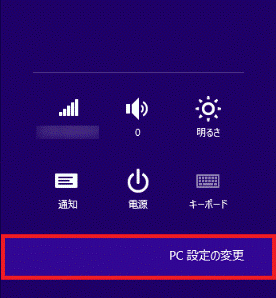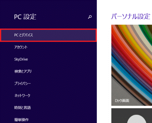 チャームの「PC設定」から、リムーバブルディスクを安全に取り外す手順は次のとおりです。