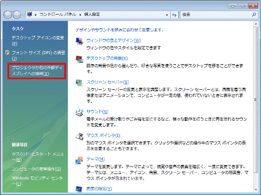 「タスク」欄の、「プロジェクタか他の外部ディスプレイの接続」をクリックします。