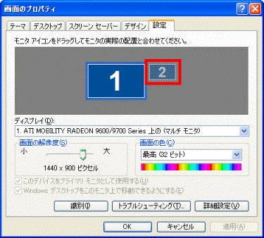 - 「モニタアイコンをドラッグしてモニタの実際の配置とあわせてください。」欄の、モニタの形をした「2」をクリックします。