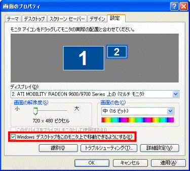 - 「Windows デスクトップをこのモニタ上で移動できるようにする」をクリックし、チェックを外します。