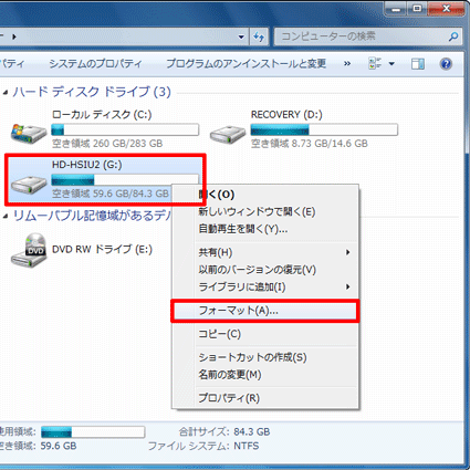 Windows 7で、ハードディスクをフォーマット(初期化)する方法は、次のとおりです。