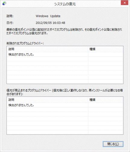 - 復元ポイントを選択した状態で「影響を受けるプログラムの検出」ボタンをクリックすると、「削除されるプログラムとドライバー」と「復元が見込まれるプログラムとドライバー(復元後に正しく動作しなくなり、再インストールが必要になる場合があります)」を確認できます。
