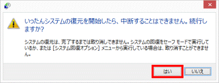 - 「いったんシステムの復元を開始したら、中断することはできません。続行しますか?」と表示されます。