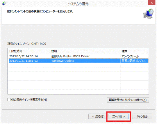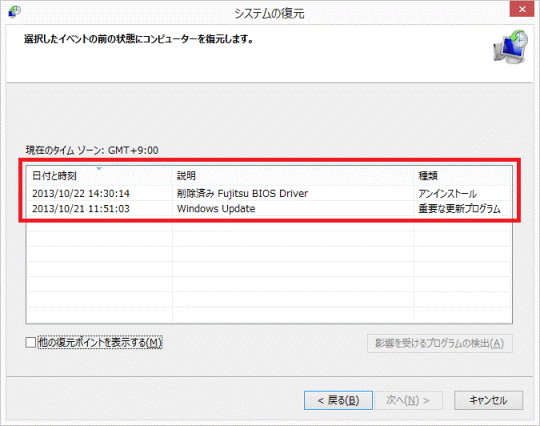 アドバイス- 「他の復元ポイントを表示する」が表示されている場合は、クリックしチェックを付けると、過去の復元ポイントも一覧に表示されます。