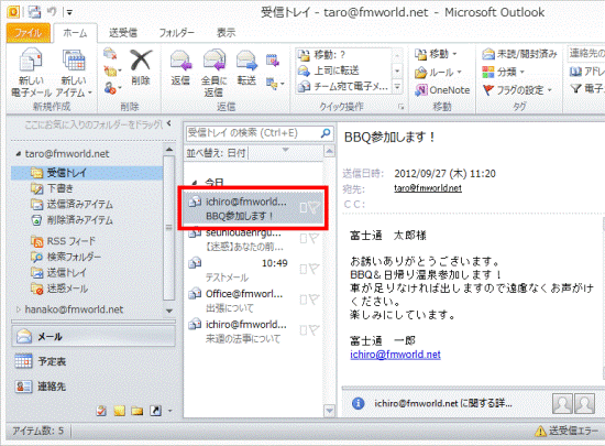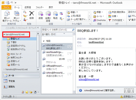 Outlook 2010に複数のアカウントが登録されている場合は、左側の一覧から、対象のアカウントをクリックします。