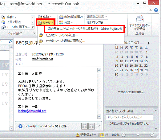 [Outlook 2010] 受信したメールを自動的に振り分ける / 削除する方法を教えてください。