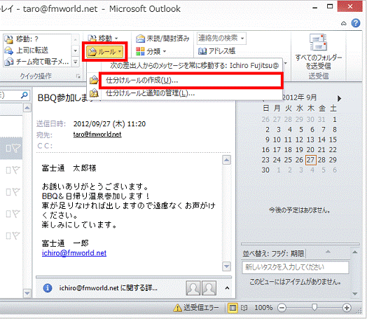 - 「ルール」ボタンをクリックし、表示されるメニューから「仕分けルールの作成」をクリックします。
